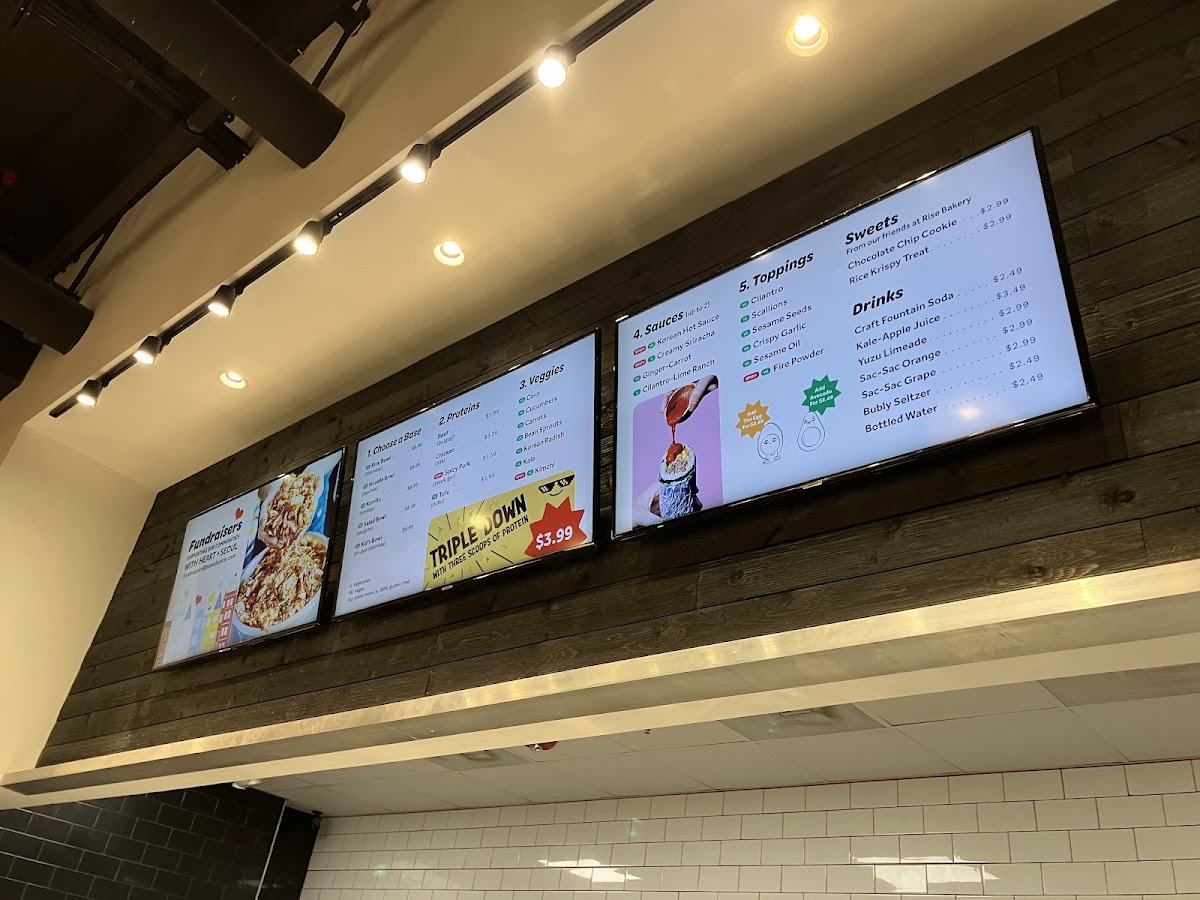 purple rice, spicy pork, Korean hot sauce, corn, Korean radish, kale slaw, kimchi, scallions, crispy garlic, roasted sesame seeds, fire powder